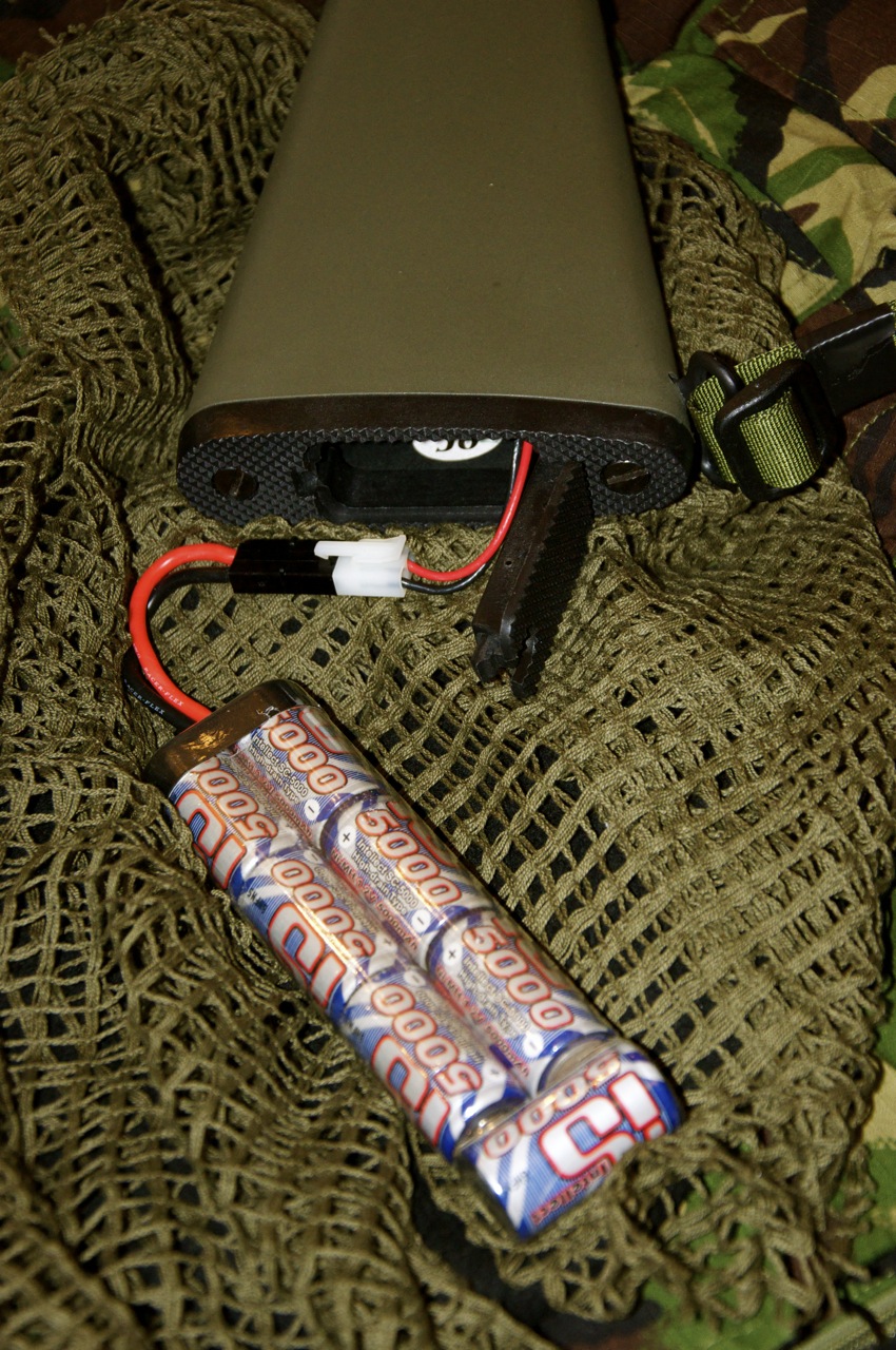 My M4 has a fixed stock, which was a requirement when I bought it, as I prefer the endurance a nice big battery gives you. I generally run it with a 5,000 mAh 8.4v item. I’m told you can use a 9.6v battery, but I’ve never really needed the extra rate of fire. Besides, I don’t want to chew up my gears quicker than I have to.