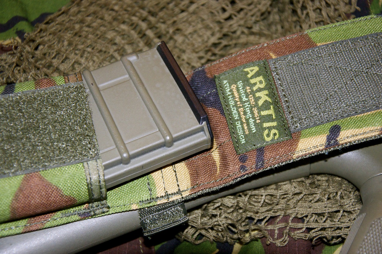 Up back, I’ve attached an Arktis single mag buttstock pouch in DPM, one of the last they made I believe. It really helps when you’re belly down and can’t grab a spare from your belt kit without a lot of squirming. I tend to rotate mags through the buttstock pouch during a fight, replacing the ready spare in pauses between action.