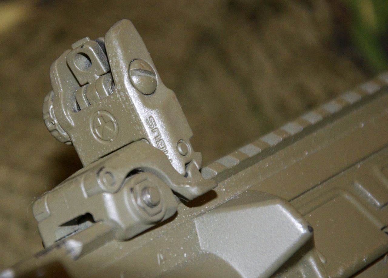 For a start, I’ve ditched the standard carrying handle and its rear sight, replacing it with a nice lightweight Magpul PTS flip-up piece that fits straight onto the Picatinny. I like the way this reduces the profile of the rifle, and it also saves a tiny bit of weight.