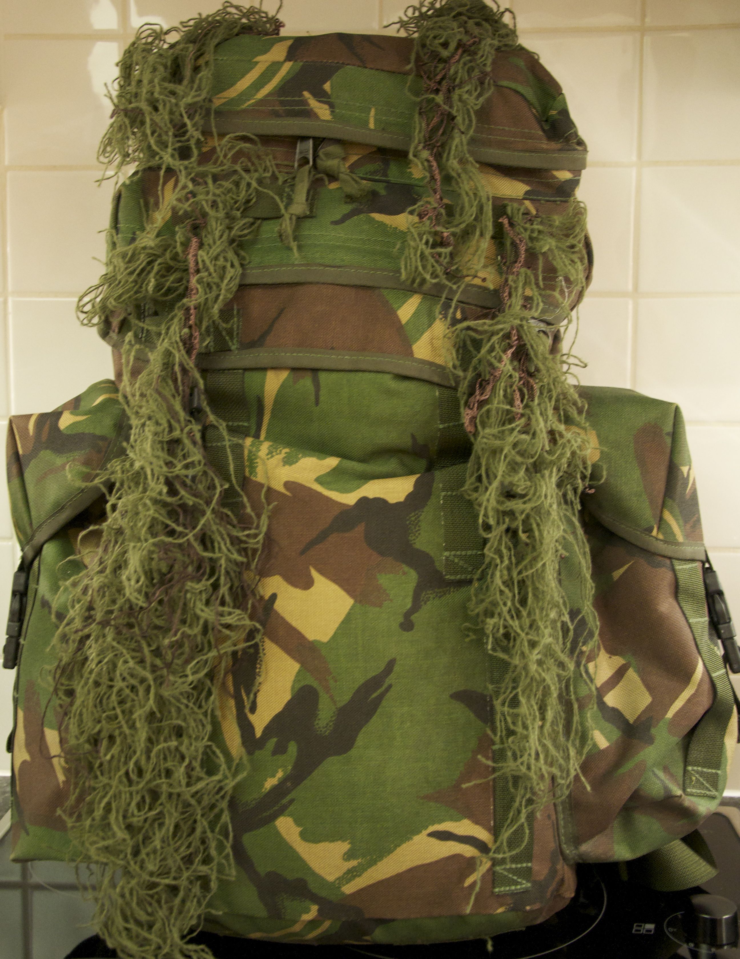 The Patrol Sack sits high on your back, out of the way of your belt kit. It’s got a main compartment, two side pockets, and a small pouch on top. Plus there are handy loops all over it for attaching camouflage, should you be so inclined.