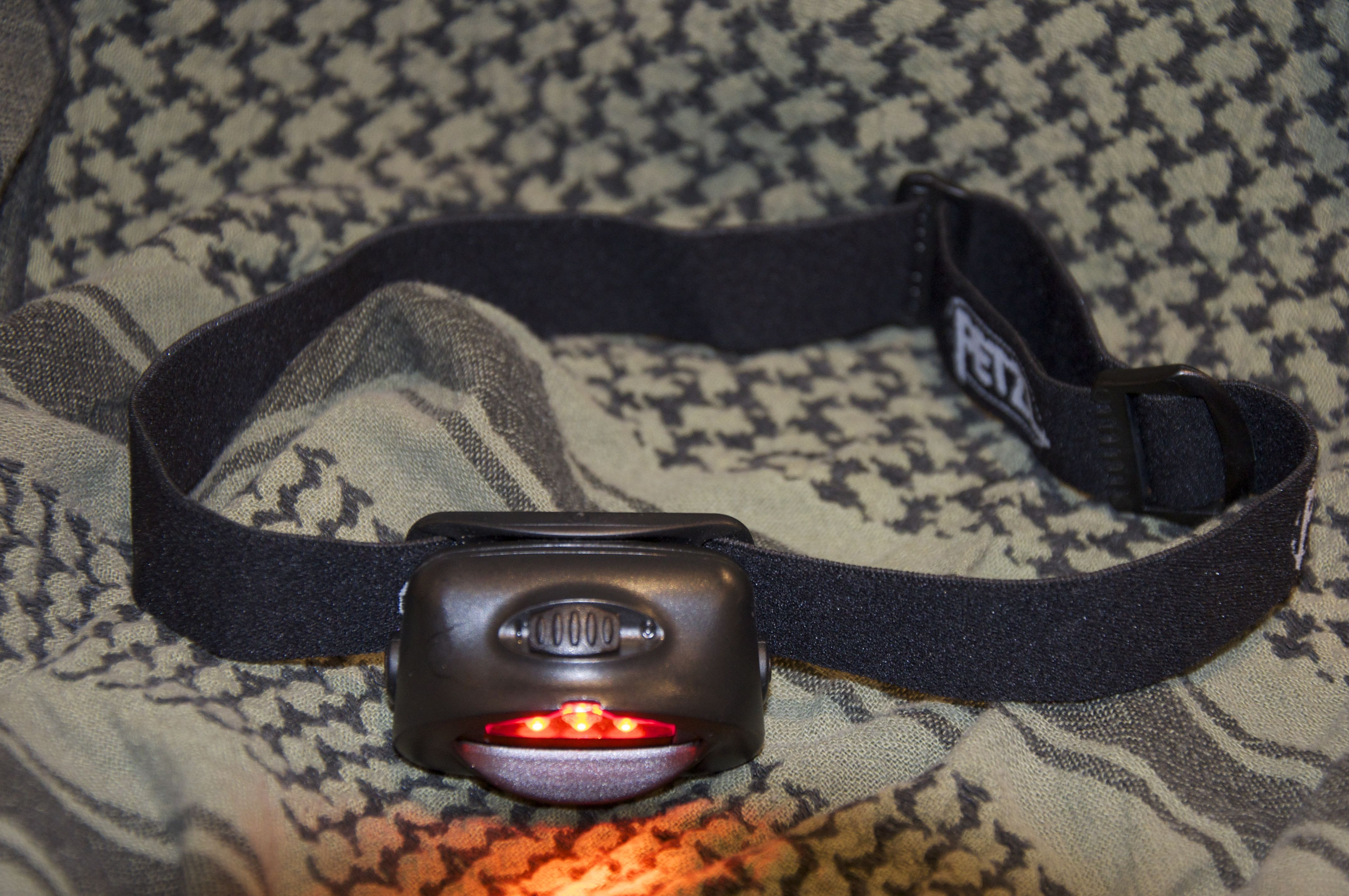 In the top pouch, I pack my additional ammo and a couple of extra grenades. Up there I also keep a Petzl head torch, the theory being that it’s the first thing I’ll need when setting up camp in the dark. It has a neat flip-down filter that turns the light red. It’s less conspicuous, and I suppose it might help preserve your night vision, though I’ve yet to check that out.