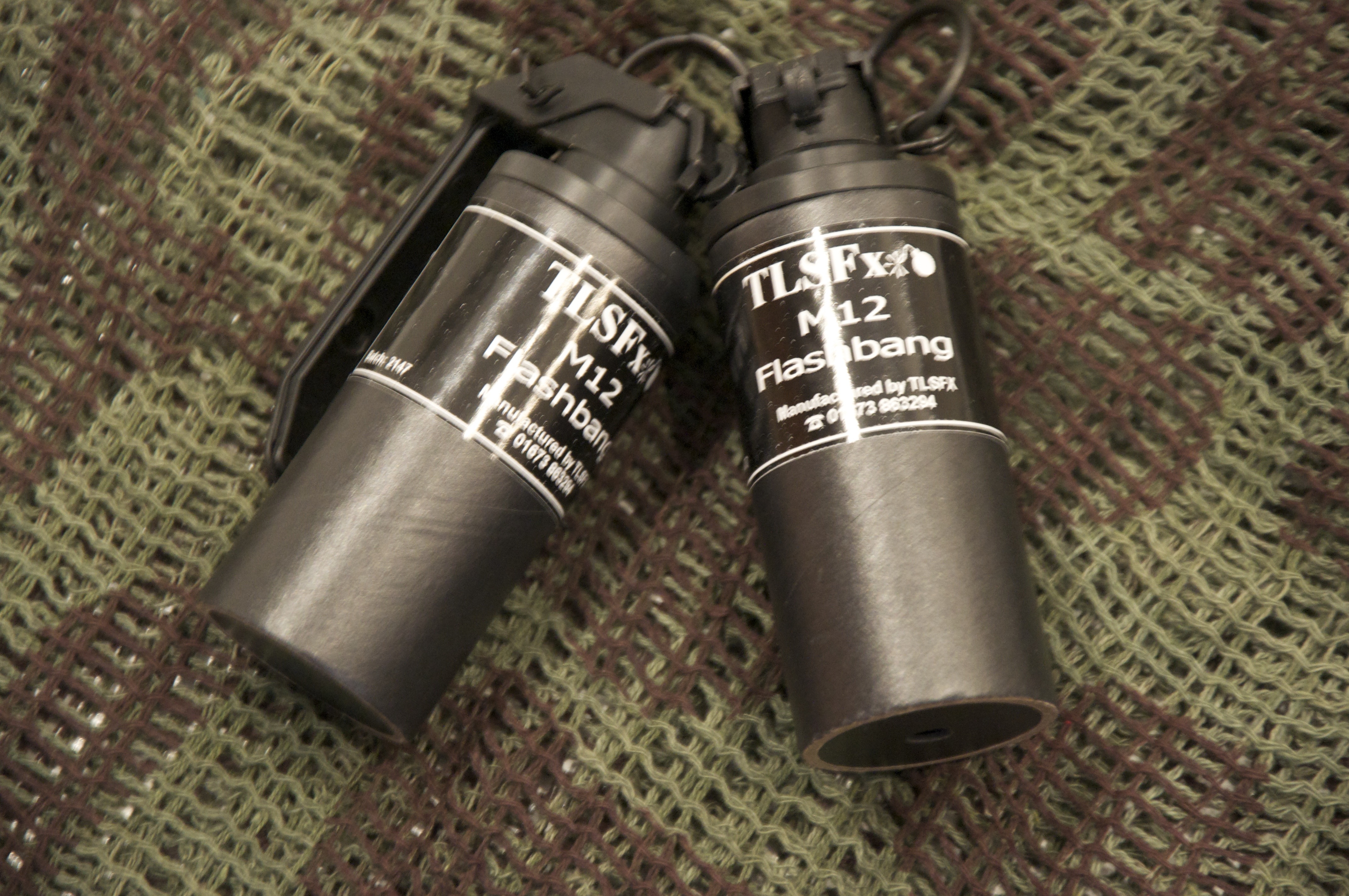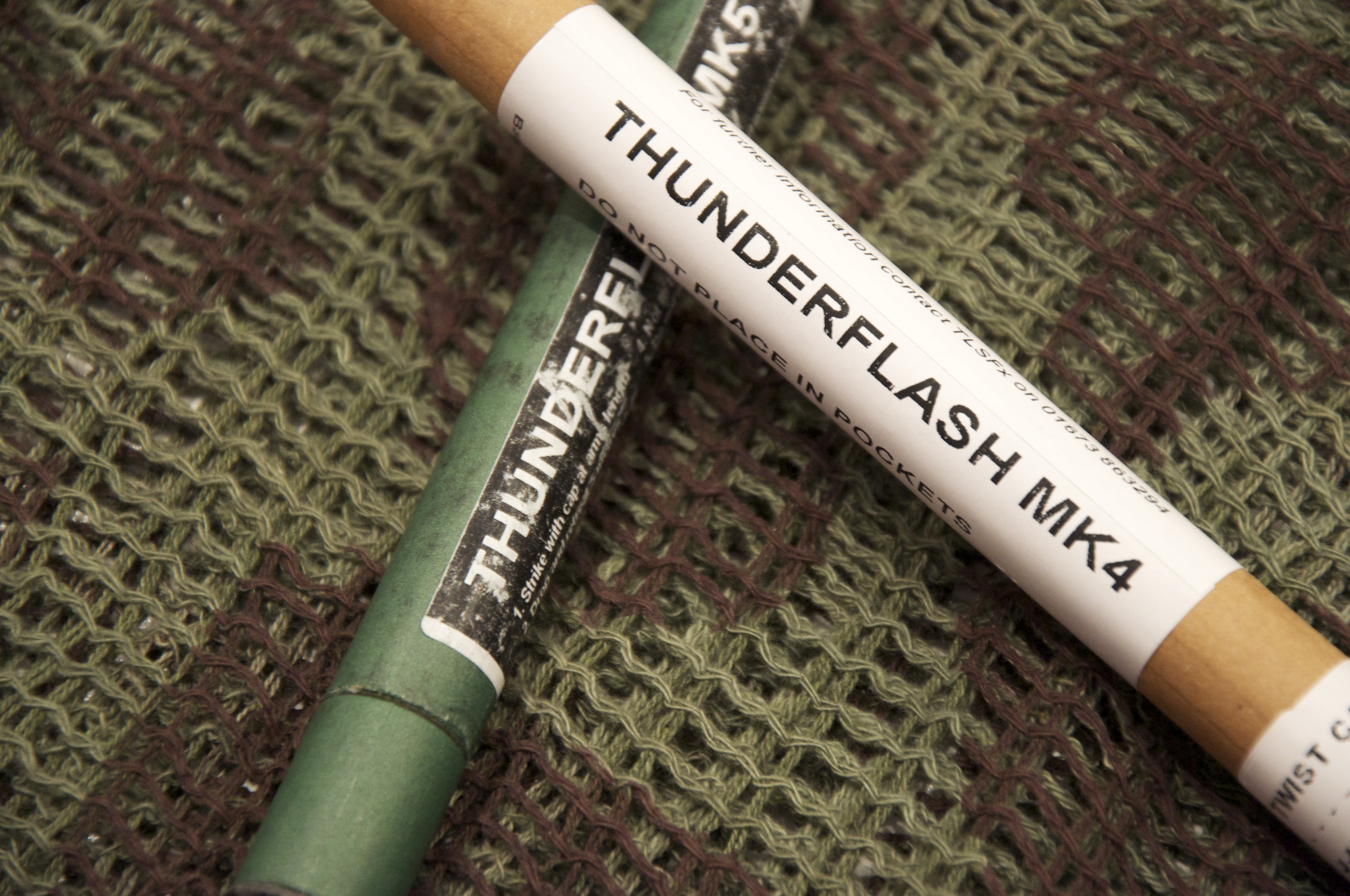 By far the most common thing that goes bang is the Mk 5 thunderflash. You can carry a lot of these, and they’re inexpensive. They make a bang of about the same amplitude as a ball grenade. Though watch it: TLSFX make them extra thick. This extra stuffing makes them quite a bit louder than the equivalents from other manufacturers.